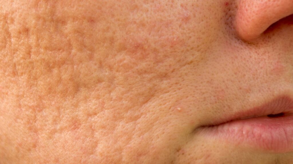 • Depressed or atrophic scarring – This form of scarring is often seen as a sunken area into skin and often look like a small, rounded pit or indentation into the skin, often resulting from ailments such as acne or chickenpox. Because of this, they tend to develop on the face and can become more noticeable with age due to the loss of collagen and elastin over time.