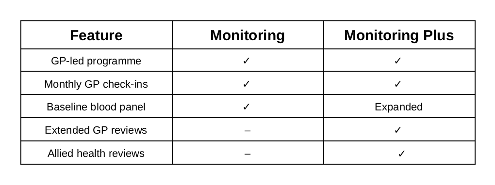 - Monthly GP check-ins (20–30 minutes)
